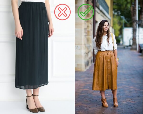 Безликая юбка из темной ткани на резинке — это признак капитуляции перед стилем. Она не подчеркивает талию, скрывает форму и создает эффект «мешка». Такой предмет гардероба действительно старит. Отдайте предпочтение юбкам с четким силуэтом и интересными деталями: модели А-силуэта с карманами или планкой, элегантные «карандаши», женственные юбки с запахом, стильные плиссе или варианты в стиле сафари. Они помогают формировать красивый силуэт и выглядят осознанно.