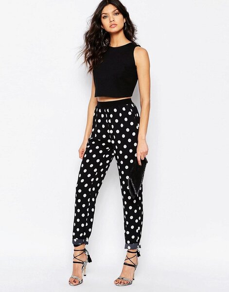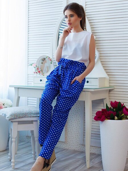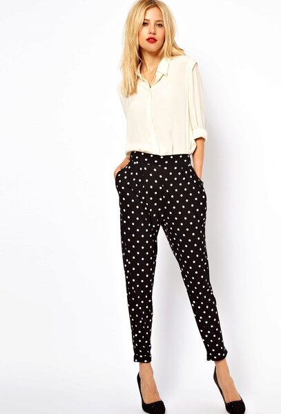Современная мода делает акцент на женственности, и брюки в горошек — прекрасный способ подчеркнуть это. Этот принт снова на пике популярности, причем в ходу все его вариации: от мелкого, почти пиксельного горошка до крупных контрастных точек. Такие брюки добавляют образу игривости и легкости. Цветовая палитра практически не ограничена, но классическое сочетание черного и белого по-прежнему остается самым востребованным и элегантным.