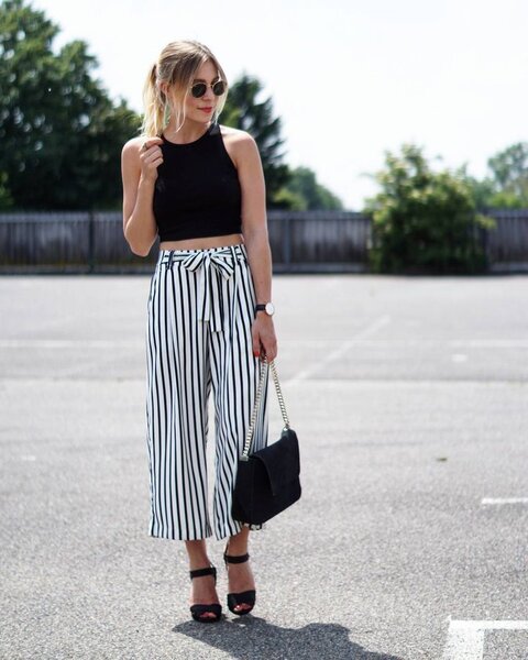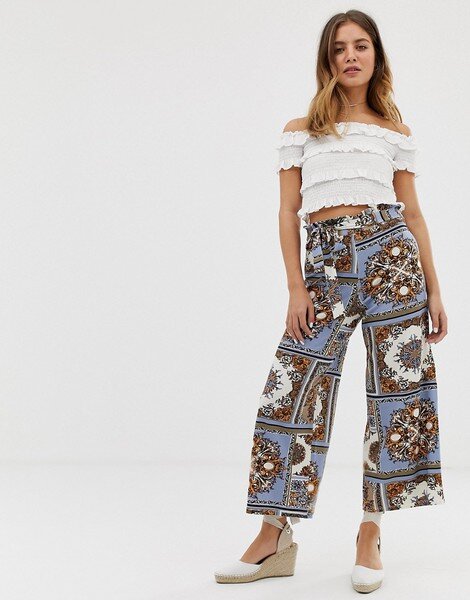 В этом сезоне наряду с классическими цветочными и анималистичными узорами в тренде оказался платочный принт. Дизайнеры перенесли узор с шелковых платков на целые предметы одежды, создав эффектные коллекции. Брюки, украшенные таким узнаваемым и графичным рисунком, станут ярким акцентом в вашем гардеробе. Чтобы образ не выглядел перегруженным, сочетайте такие брюки с лаконичными однотонными верхами: безрукавками, простыми блузами или топами-майками.