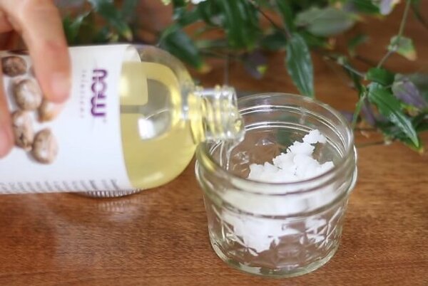 1. Возьмите миску и поместите в неё 2 столовые ложки кокосового масла. Добавьте 2 столовые ложки касторового масла.