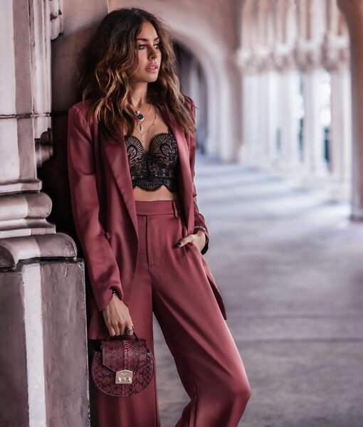 Классический костюм — вовсе не синоним скучности. Если надеть под пиджак бралетт вместо привычной блузки, образ мгновенно приобретет современную изюминку и продемонстрирует безупречный вкус своей обладательницы. Это смелый, но очень элегантный ход.