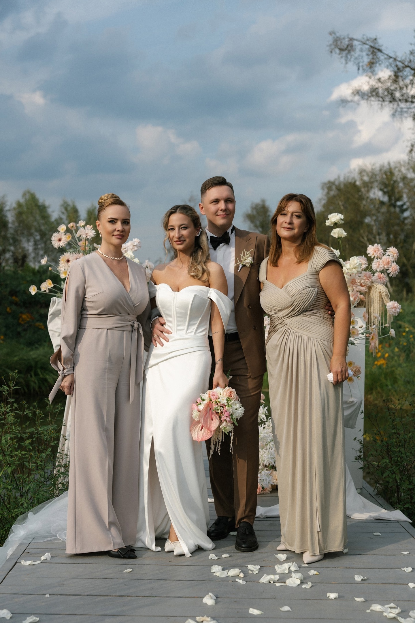 Если свадьба включает венчание, важно помнить о правилах посещения храма. В церковь не принято заходить с открытыми плечами, глубоким декольте или голой спиной. Позаботьтесь об этом заранее: возьмите с собой нарядный пиджак, болеро, шаль или элегантный платок. Это не только знак уважения к месту и традициям, но и практично — в церкви часто бывает прохладно.