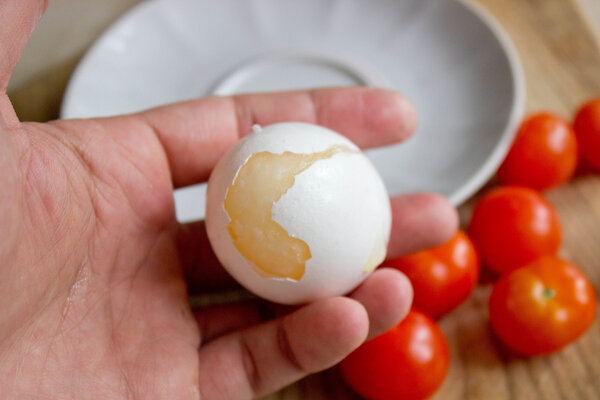 Перед очисткой подготовьте сковороду: разогрейте ее и смажьте маслом. Сначала может показаться, что снять скорлупу с замерзшего яйца невозможно, но стоит немного подержать его в руках, и она легко отойдет.