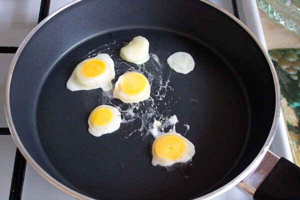 Через 2–3 минуты жарки получаются аккуратные маленькие яичницы. Они выглядят, как глазунья из перепелиных яиц: белок равномерно растекается, а желток сохраняет выпуклую форму.