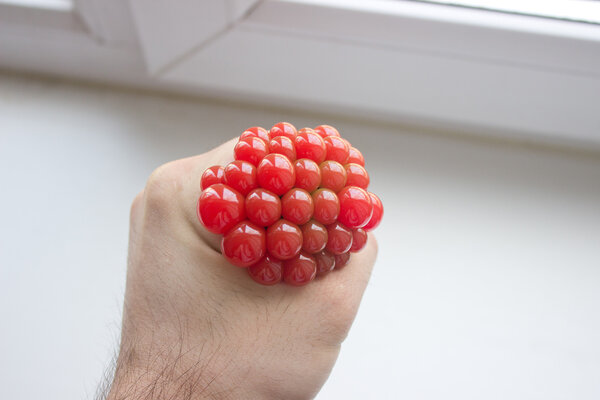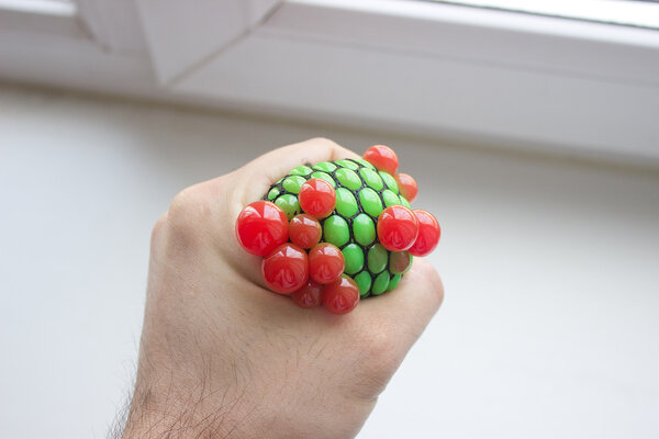 Особенность игрушки в её трансформации: при сжатии из ячеек сетки выходят бусины контрастного цвета. В нашем случае из зелёного шара появлялись красные элементы.
