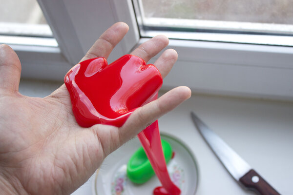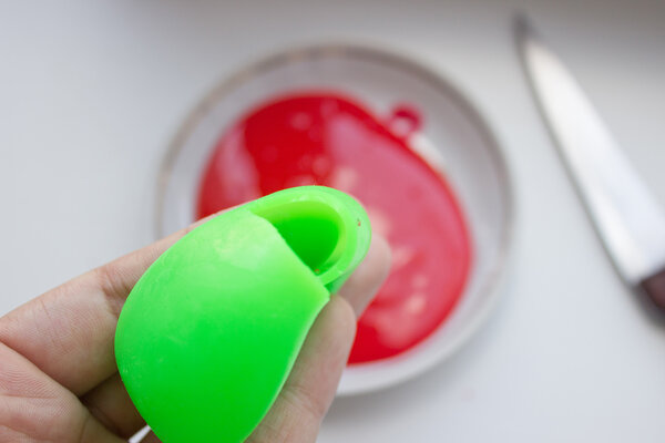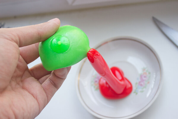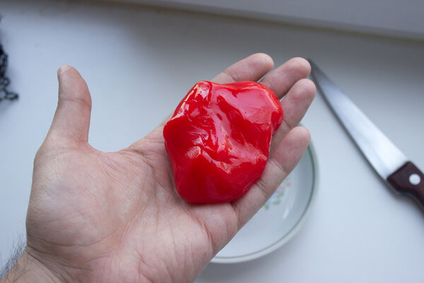 Внутри обнаружилась красная масса, по консистенции очень похожая на слайм (лизун), который обычно делают из тетрабората натрия и клея ПВА.