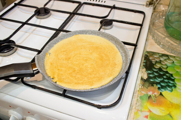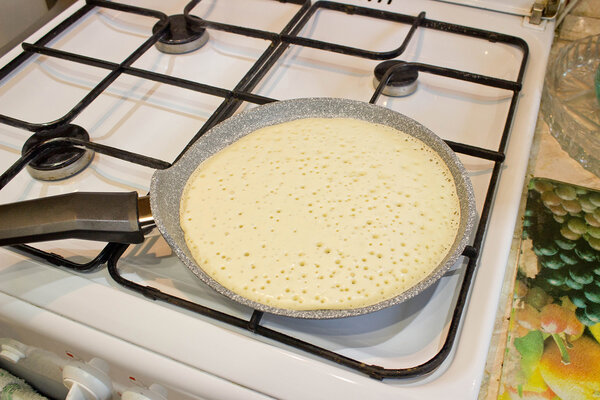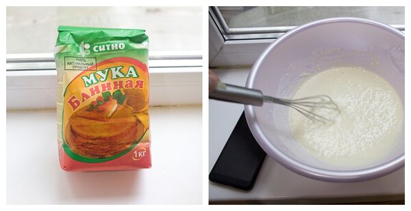 250 граммов муки мы размешали в 400 мл тёплого молока до однородной консистенции без комочков. После этого приступили к выпеканию.