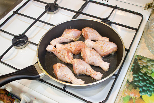 Достаём курицу из холодильника, слегка присыпаем каждую голень молотой корицей и выкладываем на хорошо разогретую сковороду с растительным маслом.