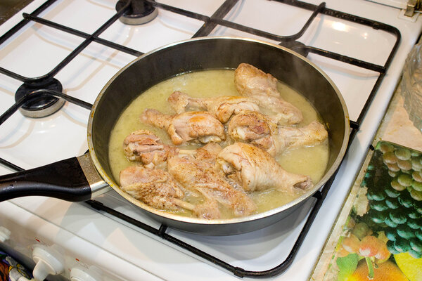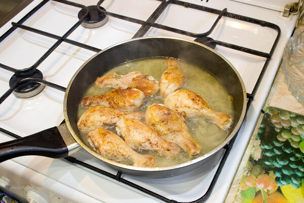 На обжарку у меня ушло около 20–25 минут. Следующий шаг — добавляем в сковороду немного кипятка. Воды нужно столько, чтобы голени были погружены в неё примерно наполовину.