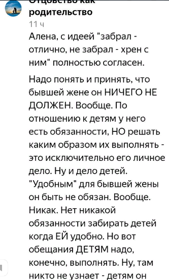 Да, если у мужчины есть ребёнок, он должен вкладывать в него время, деньги, силы, внимание и прочие ресурсы. И женщина должна, конечно же. Вот только некоторые считают иначе, как видно из следующего скриншота: