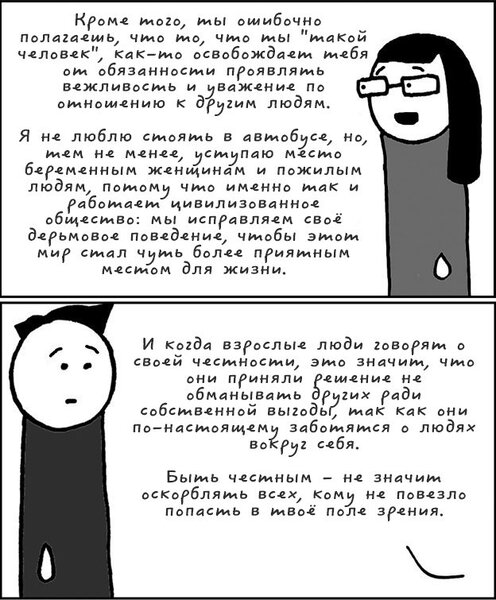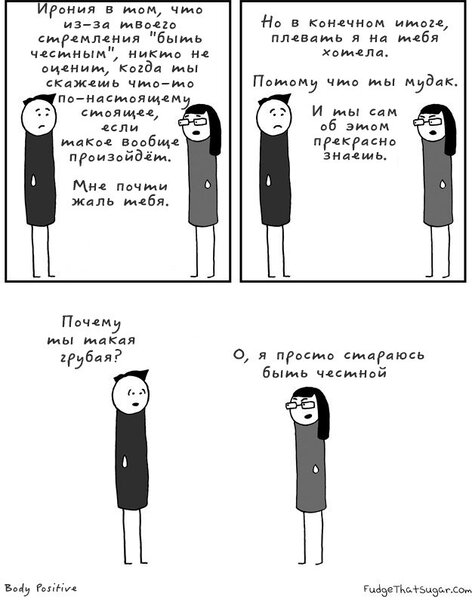 «Не думайте, что кто-то не в курсе вашей "правды". Обычно очень даже в курсе. И ваша "правда" — попытка прикрыть обычную человеческую грубость. Читай: попытка ударить и не получить в ответ. Ударить этой "правдой" исподтишка, подленько, как кастетом, спрятанным в ладони. И унести свою шкурку целой после этого».Существует принципиальная разница между двумя ситуациями. Первая — когда вас прямо спросили о вашем мнении по конкретному вопросу, и вы дали честный ответ. Совершенно иная история — когда вас не спрашивали, а возможно, даже не хотели видеть, но вы всё равно навязываете свою точку зрения.