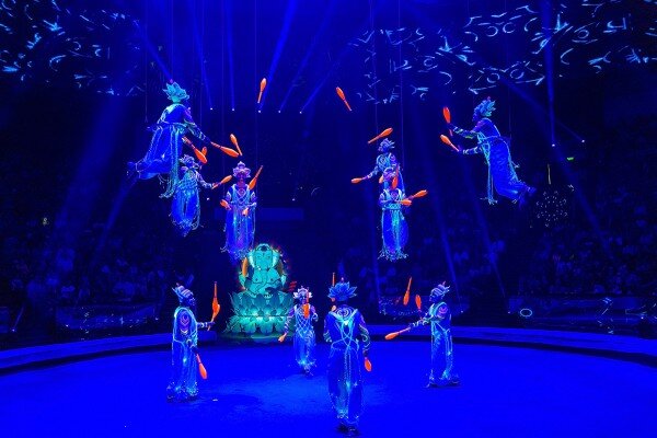 Затем наступает черед «Ритуальной Индии». Жонглеры под руководством заслуженной артистки России Елены Бараненко в традиционных костюмах завораживают зрителей игрой с неоновым светом и иллюминацией. Номер начинается на арене, но постепенно усложняется, поднимаясь в воздух на разных уровнях. Летающие булавы, управляемые артистами, — это зрелище, достойное оваций стоя.