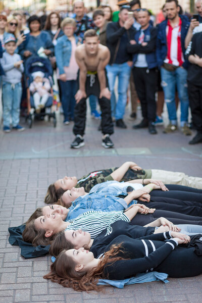 Оказалось, что смелые парни из Сибири устроили шоу: они перепрыгивали через лежащих девушек, делая сальто. Зрелище было эффектным. А вот и сами акробаты.