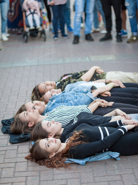 Вскоре я уперся в огромную толпу зевак. С трудом пробившись вперед, я увидел необычное зрелище: шесть девушек лежали на мостовой, а одна из них была особенно привлекательна.