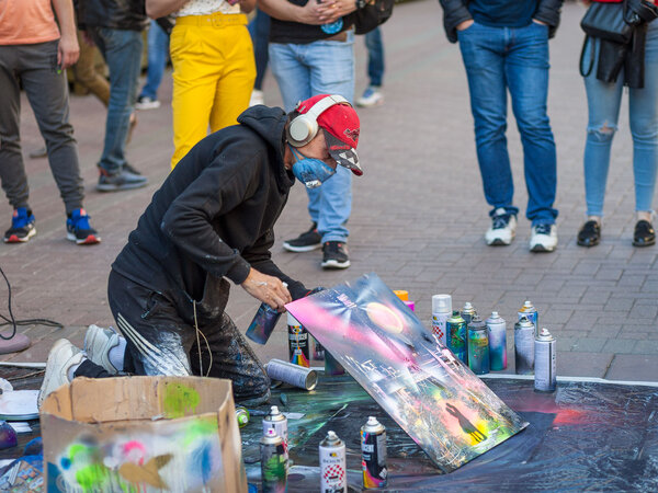 Далее я задержался у художника, создающего картины аэрозольными баллончиками. Его работы стоят около тысячи рублей. Я помню его уже лет десять — он постоянный участник арбатской тусовки и всегда собирает вокруг себя зрителей.