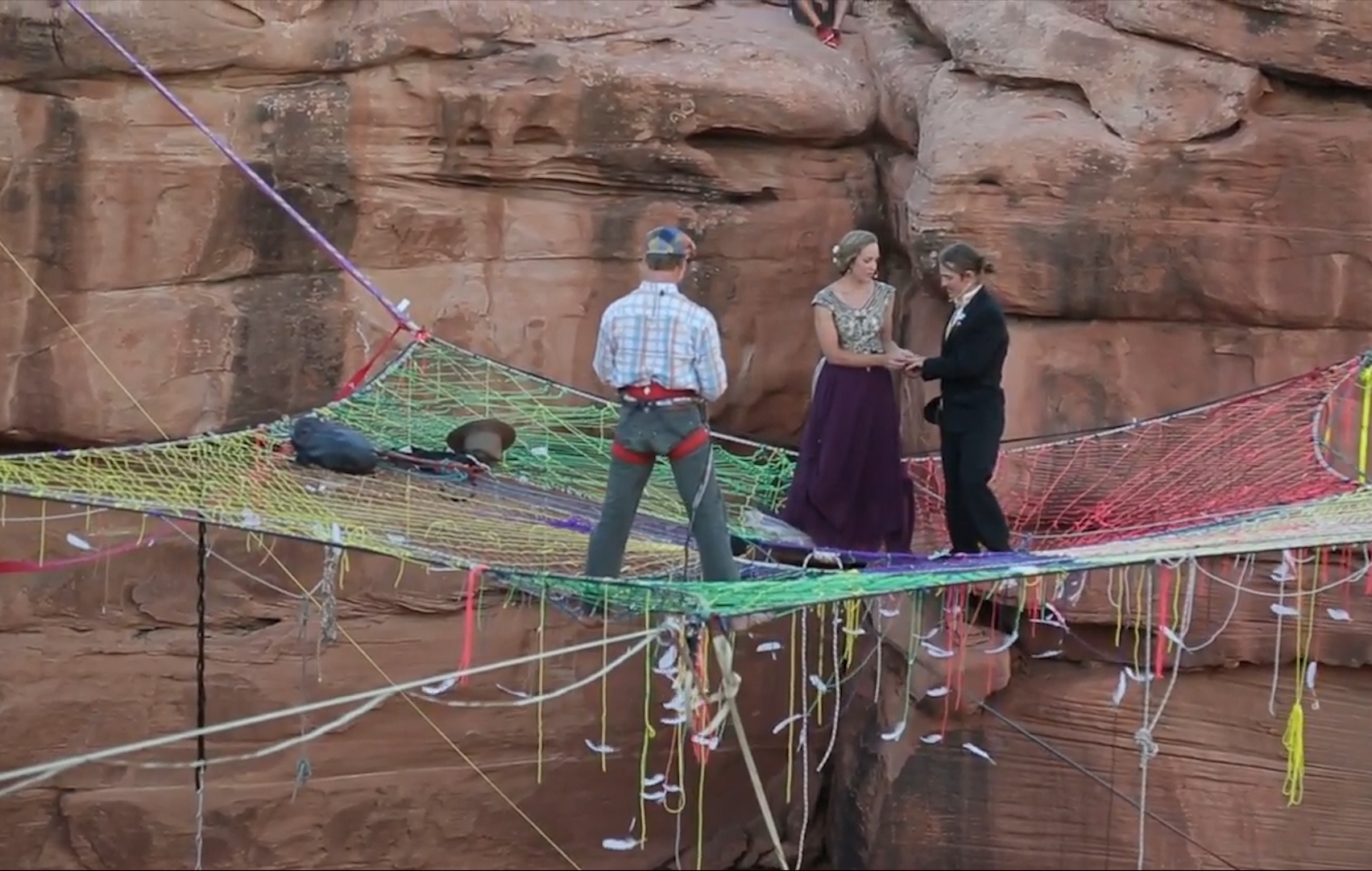Специальную сеть для церемонии, которая стала главной площадкой для бракосочетания, соорудил свидетель пары — профессиональный спортсмен-экстремал. Он использовал надёжные крепления, которые не только удерживали конструкцию, но и гарантировали максимальную безопасность для молодожёнов. Интересно, что даже в таких необычных условиях пара не забыла о традициях: был создан специальный проход, напоминающий дорожку к алтарю в классической церковной церемонии.