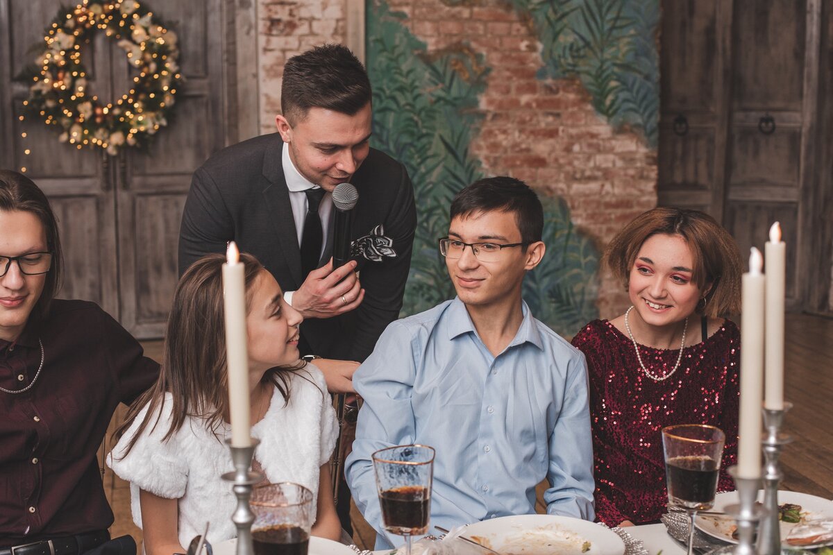 Ведущий Андрей блестяще справился с задачей развлечь разновозрастную компанию. Он предложил отказаться от резких конкурсов в пользу семейных интерактивов, викторин и теплых воспоминаний о паре.
