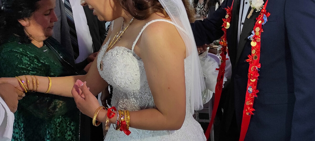 Церемония дарения началась с нашего стола, где сидел свидетель. Монеты прикалывали на красную ленту на груди жениха, а невесту украшали браслетами и колье простого дизайна — красота должна быть практичной!