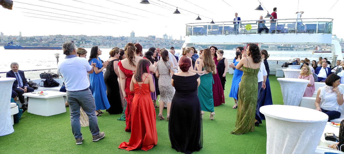 Погода в день торжества была прекрасной, что позволило гостям, особенно женщинам, предстать во всей красе. Нужный корабль у пристани рядом с мечетью Долмабахче мы нашли... по запаху. К нему нас привел мощный парфюмерный шлейф, с которым вряд ли справился бы сам древнегреческий бог ветра Эол.