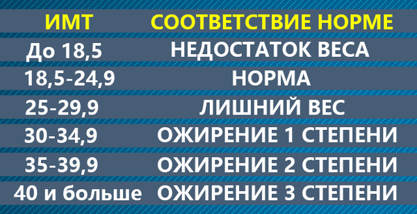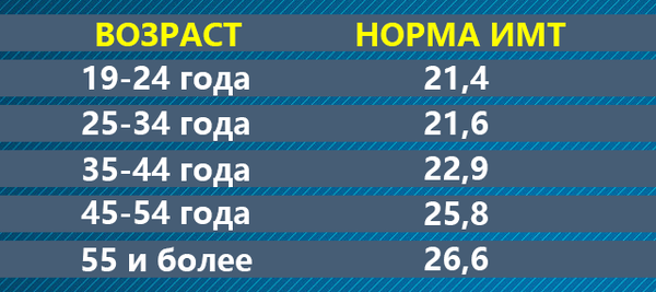 Для более точной оценки существуют отдельные таблицы оптимальных значений ИМТ для мужчин и женщин. Рассчитайте свой индекс по той же формуле (вес в кг / (рост в м)2) и сверьтесь с данными ниже.