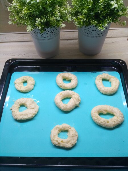 Шаг 2: Формируем ватрушки. Я использовала небольшой лайфхак для аккуратной формы: переложила тесто в целлофановый пакет, отрезала уголок и, как из кондитерского мешка, выдавила порции теста на силиконовый коврик для выпечки.