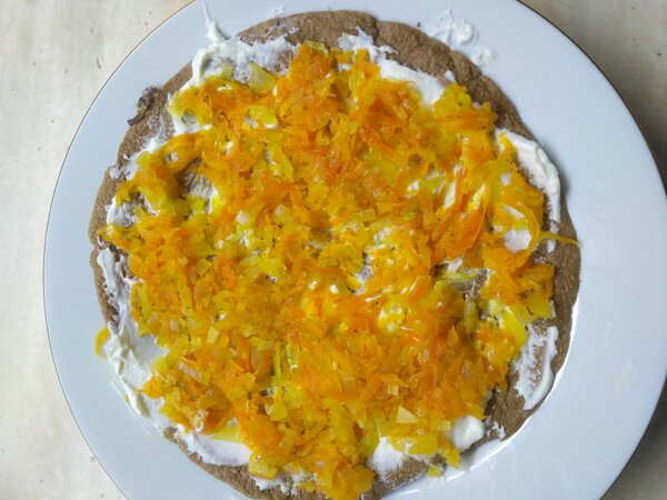 Шаг 4: Формирование рулетиков. Когда все компоненты готовы, можно приступать к сборке. На еще теплый печеночный блин равномерно нанесите тонкий слой творожного сыра. Для пикантности можно добавить немного тертого чеснока. Поверх сыра выложите подготовленную овощную начинку. Аккуратно сверните блин в плотный рулет.