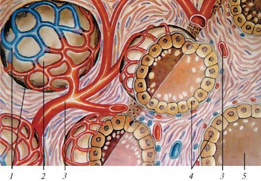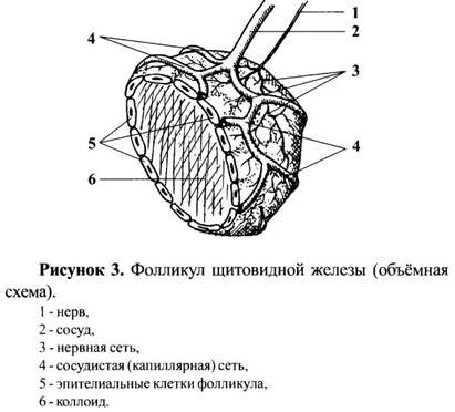 На схеме показаны: 1 — капилляры вокруг фолликула, 2 — клетки фолликула (тиреоциты), 3 — артериола, 4 — ядра тиреоцитов, 5 — коллоид с гормонами внутри фолликула.