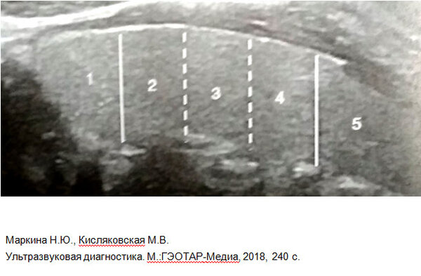 Таким образом, каждая доля состоит из нескольких крупных продольных сегментов, которые делятся на сегменты среднего размера, а те, в свою очередь, — на самые мелкие структурные единицы — дольки. Примечательно, что в стандартных протоколах УЗИ термин «долька» практически не используется, что говорит об определённом упрощении в клинической практике.