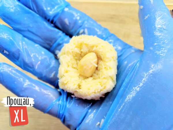 Из готовой массы я сформировала небольшие шарики. В центр каждого я поместила по одному миндальному орешку. Предварительно я замочила миндаль в кипятке на 30 минут, а затем очистила его от тёмной кожицы — так он становится мягче и вкуснее.