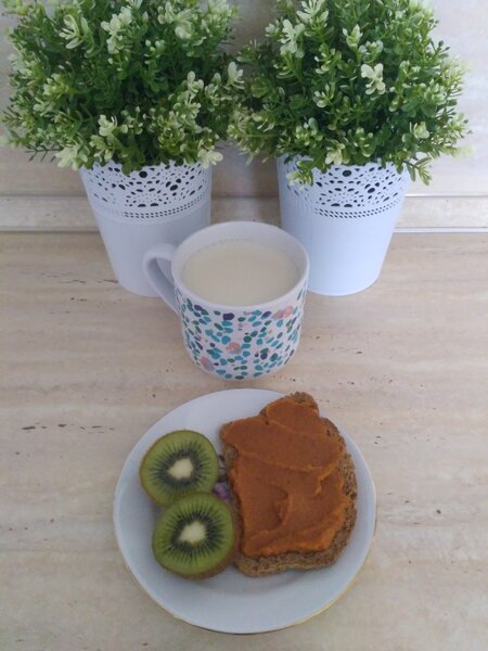 Мой перекус состоял из цельнозернового хлеба (25 г) с кабачковой икрой (40 г), киви (90 г) и согревающего зеленого чая с молоком. Такой молокочай, кстати, помогает выводить лишнюю жидкость из организма.