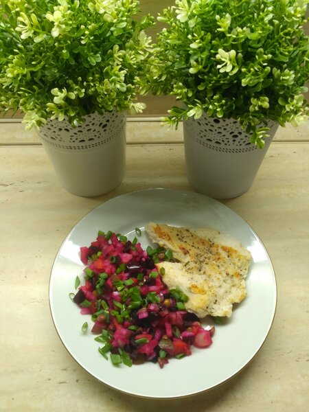 Планировала на ужин тушеную мексиканскую смесь, но аромат маминого винегрета (порция 120 г) был непреодолим. Я уступила желанию, заправив салат всего каплей масла. К винегрету добавила куриную грудку (200 г в сыром виде), обжаренную на антипригарной сковороде без масла.
