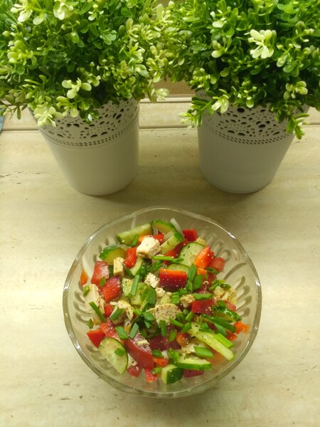 Салат получился очень простым и вкусным: тонко нарезанный лук полукольцами нужно сбрызнуть лимонным соком, добавить каплю оливкового масла (в оригинале — подсолнечного), щепотку соли и слегка помять вилкой. Затем добавляем свежие овощи: огурец, помидор, болгарский перец и куриную грудку, обжаренную на сухой антипригарной сковороде. Получилось около 300 г салата.