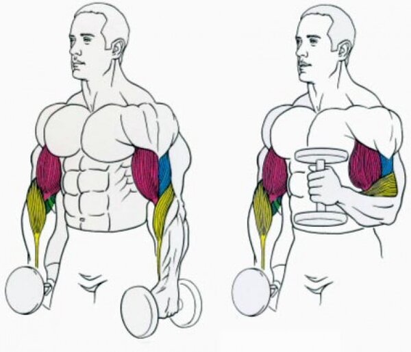 Что качаем: бицепсы и плечевые мышцы (брахиалис). Этот хват позволяет гармонично развивать объём руки.