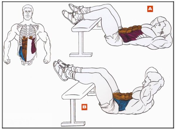 Что качаем: прямые и косые мышцы живота. Техника: отрывайте от пола только лопатки, не давите руками на шею, выдох делайте на усилии.