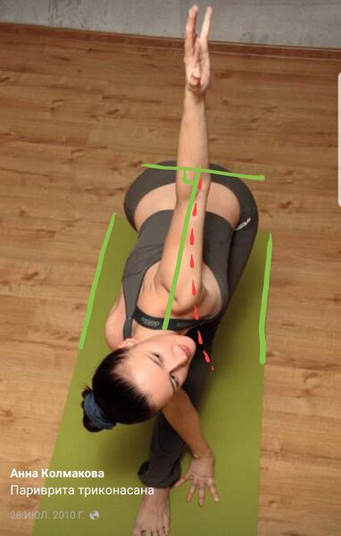 В таких позах особенно велик соблазн использовать руку как рычаг для более глубокого поворота. Однако это приводит к перекручиванию в грудном отделе, в то время как движение должно идти от талии. Гораздо полезнее выполнить менее глубокое, но равномерное скручивание, активно задействуя мышцы кора и минимизируя давление рукой.