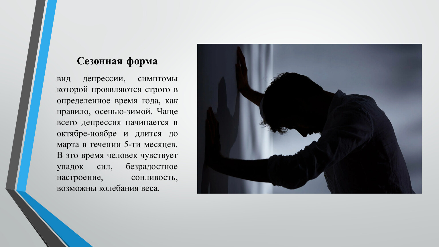 Хандра имеет причину, депрессия может быть «беспричинной». Грусть — часть жизни, депрессия — ее остановка. Если состояние подавленности, апатии и безнадежности не отпускает вас более двух недель и мешает работать, общаться и радоваться — не списывайте это на «сложный период» или слабость характера. Обратитесь к врачу. Своевременная диагностика и лечение депрессии — это признак заботы о себе, а не слабости.