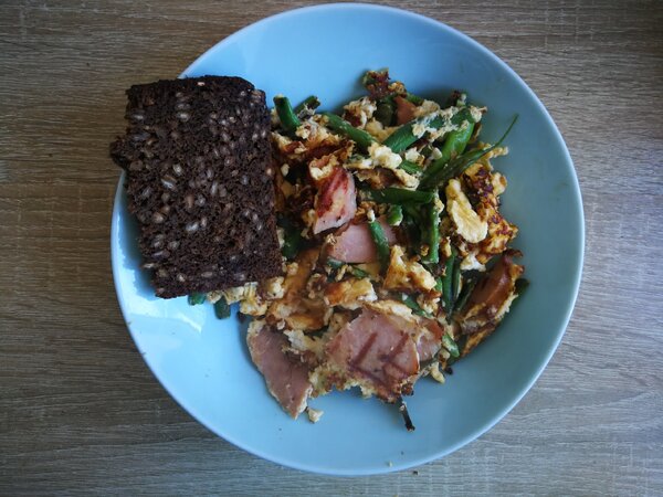 На обед у меня был омлет с фасолью и куриным рулетом, а также кусочек цельнозернового хлеба.
