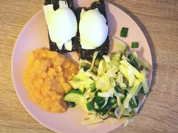 На ужин была чечевица, цельнозерновой хлеб, яйцо и капуста.