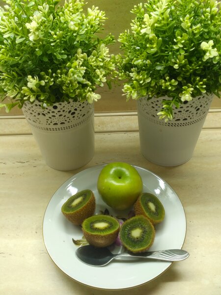 Углубившись в работу, я сделала легкий перекус свежими фруктами: яблоко (115 г) и киви (130 г). Это отличный источник витаминов и клетчатки, который помогает сохранить энергию до обеда.