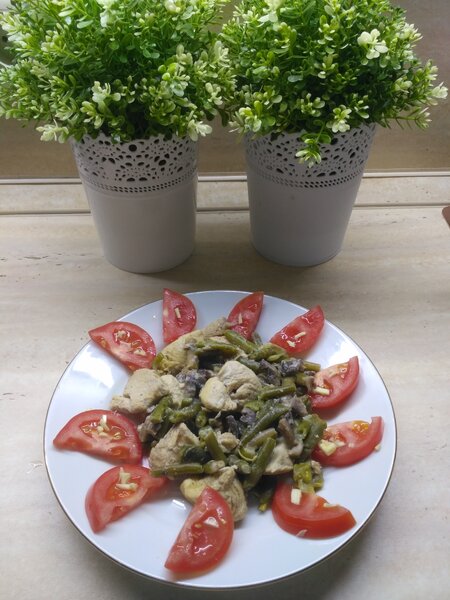 Завершила день я ужином из тушеной куриной грудки со стручковой фасолью и грибами (300 г) и свежим помидором. Простое, полезное и низкокалорийное блюдо, идеальное для вечера.
