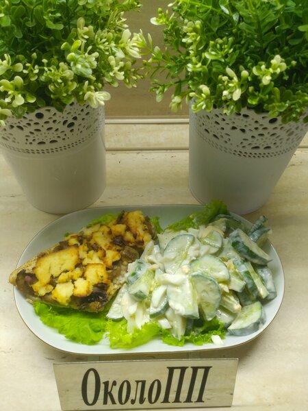 Вечерний прием пищи состоял из вчерашней заготовки — сочного куриного филе под грибами и мягким сыром (120 г). К нему я подала легкий салат из вареного яйца и огурца (100 г), заправленный сметаной (около 20 г). Сытно, полезно и идеально для конца дня.