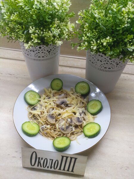 Сегодня мне захотелось макарон, которые я давно не ела. На обед я приготовила цельнозерновые макароны (50 г в сухом виде) в нежном сливочно-грибном соусе (из 100 г свежих грибов). Сверху я щедро посыпала блюдо маложирным сыром (60 г) — он добавил кремовости и насыщенного вкуса. На гарнир — свежий огурец (60 г).