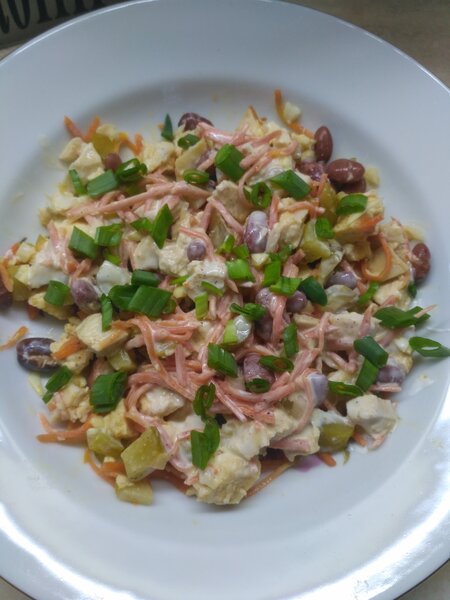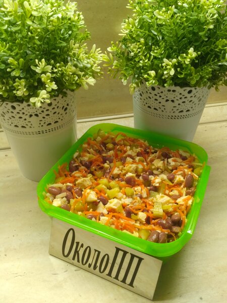 В большую миску сложите все подготовленные ингредиенты. Добавьте к ним морковь по-корейски и фасоль, предварительно слив с неё жидкость. Всё тщательно перемешайте.