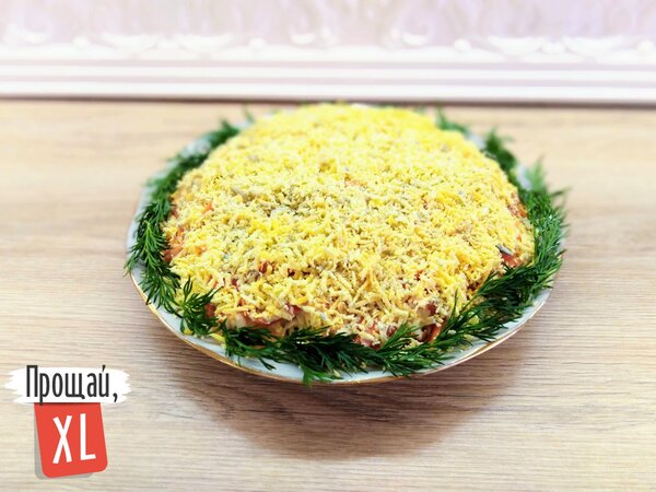 Пятый слой и украшение: 82 грамма яичных желтков натираем на мелкой тёрке и посыпаем ими салат сверху — это создаст красивый жёлтый «ковёр». Готовый салат можно украсить веточками свежего укропа.
