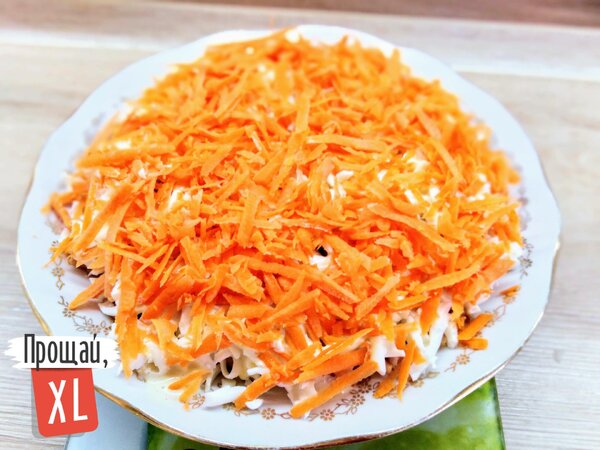 Четвёртый слой: 55 граммов свежей моркови натираем на тёрке. Морковь добавит цвет, сладость и витамины.