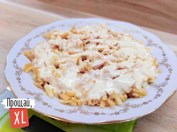 Этот салат — отличный вариант для тех, кто следит за питанием. Его калорийность без заправки составляет всего 68 ккал на 100 граммов. С заправкой — около 165 ккал. Я использую домашний ПП-майонез, который готовится буквально за две минуты: нужно взбить блендером 80 г подсолнечного масла, одно сырое яйцо и чайную ложку горчицы до консистенции магазинного майонеза. На весь салат у меня ушло около 130 граммов этой заправки — ею я промазывала каждый слой.