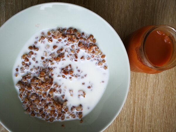 Завтрак: Гречневая каша с молоком и фруктовым пюре.
