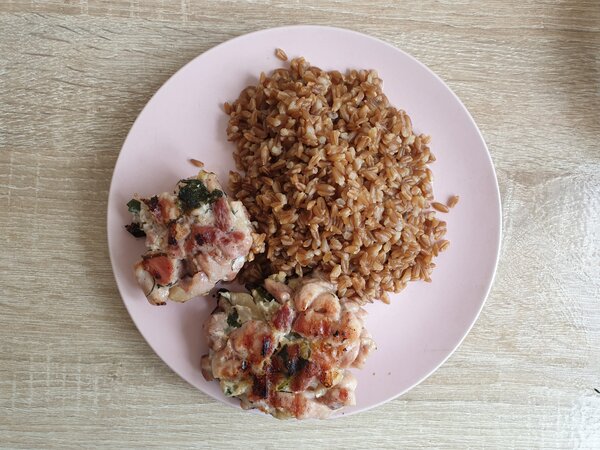 Обед: Примерно 350 калорий: 110 грамм куриных котлет с патиссоном (да, пришлось уточнить правописание этого овоща!) и зеленью, а также 140 грамм отварной полбы.