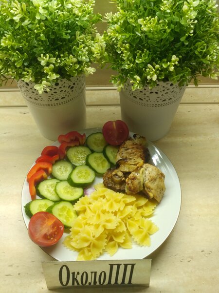 На обед мы доели вчерашний шашлык из индейки (около 100 г). К нему я добавила порцию отварных макарон из твердых сортов пшеницы (примерно 100 г в готовом виде) и свежие овощи.