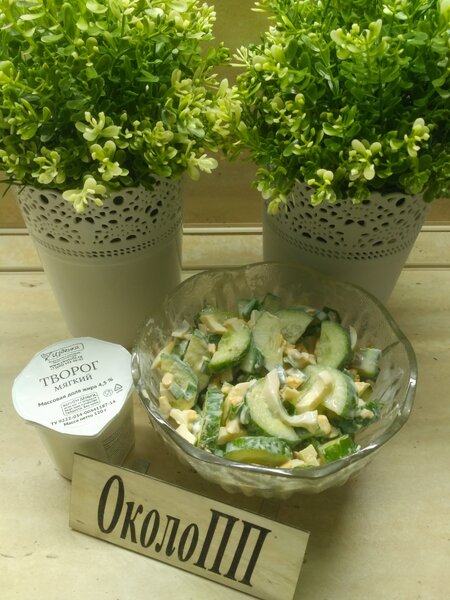 Легкий и сытный ужин: салат из двух отварных яиц, свежего огурца и зеленого лука, заправленный мягким творогом (30 г). Оставшуюся часть творога (еще 30 г) я съела примерно за три часа до сна в качестве позднего перекуса.